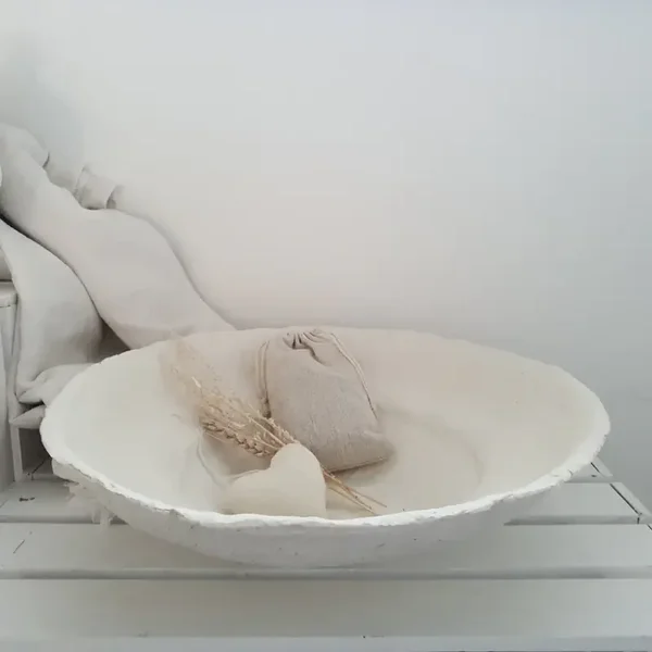Grote papiermache schaal met een diameter van maar liefst 38 cm. Leg je mooiste spullen erin of brand een mooi kaars in zand erin. Doordat de schaal handgemaakt is is deze uniek.