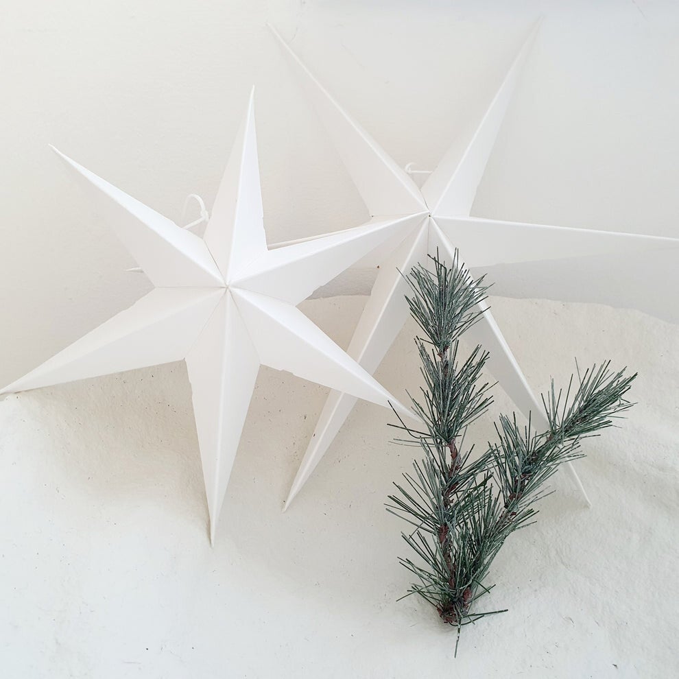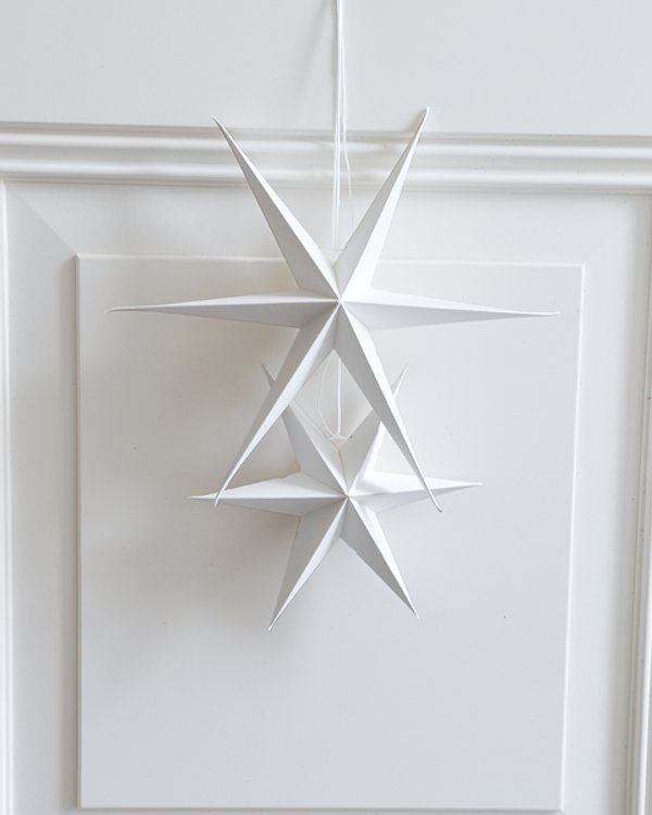 De papieren kerst ster wit van Delight Department is gemaakt van stevig wit papier. De witte kerstster wordt geleverd in een set van twee stuks, in twee verschillende diameters. De kleine ster heeft een diameter van 20 centimeter, de grote ster heeft een diameter van maar liefst 30 centimeter! De witte kerststerren worden geleverd als een plat pakketje. Vouw de papieren kerst ster wit open en zet hem vast door middel van het bijgeleverde koordje. Natuurlijk is het super mooi om de Delight Department witte ster op te hangen. Maar ook als staand object op bijvoorbeeld je dressoir is de kerst ster een plaatje om te zien.