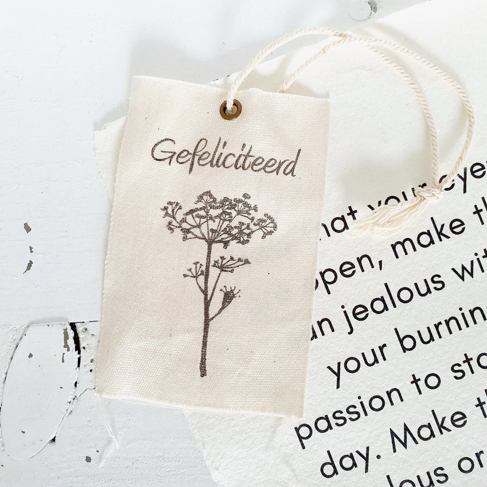 Label van canvas met een natuurkleur touwtje. Leuk om bij je cadeau te geven.
