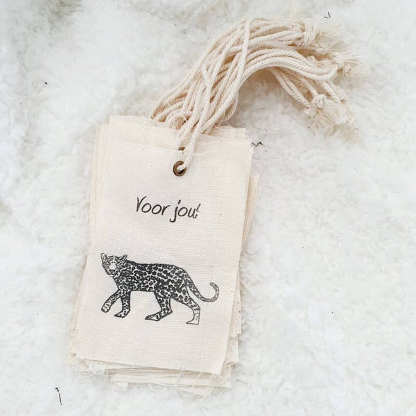 Label van canvas met een natuurkleur touwtje. Leuk om bij je cadeau te geven.